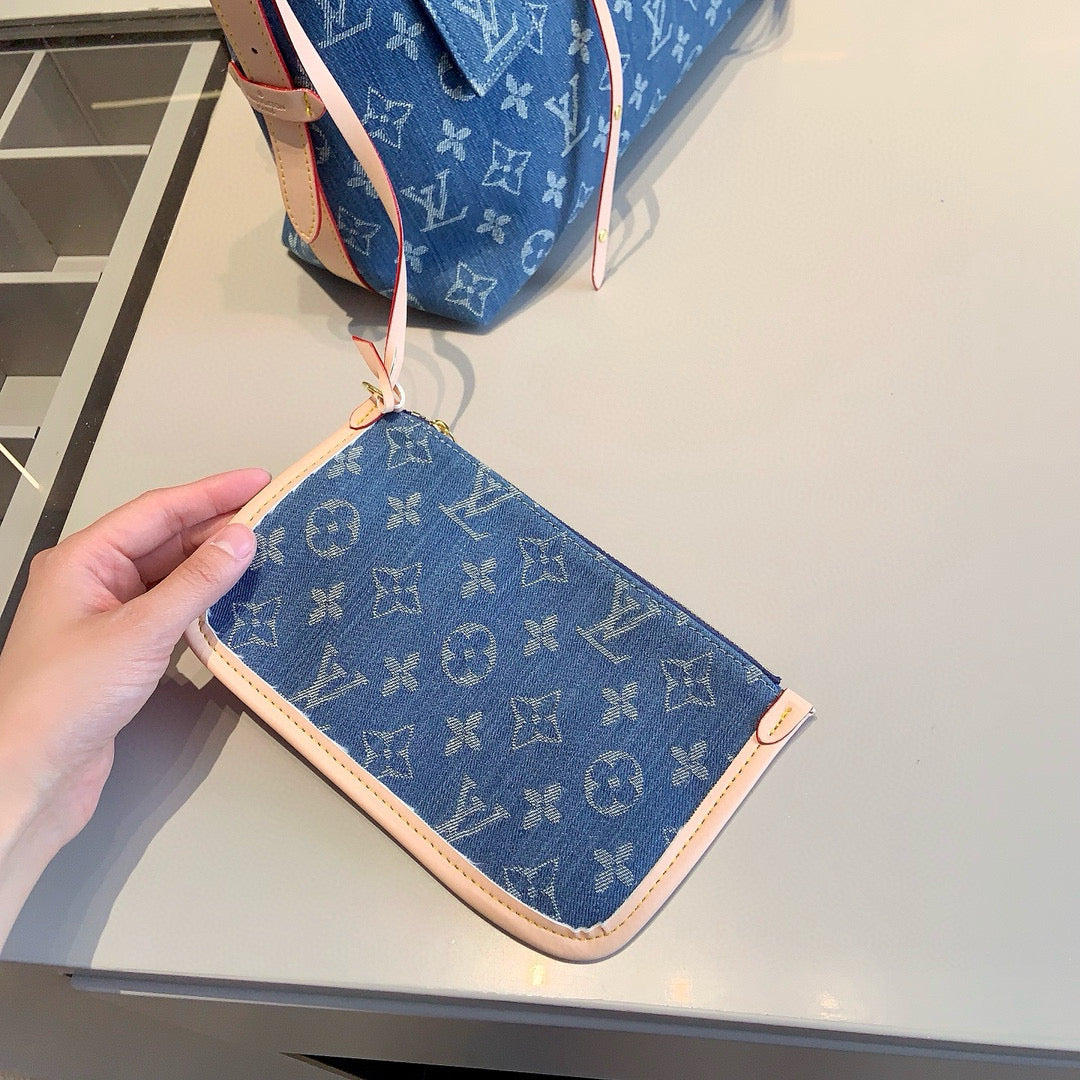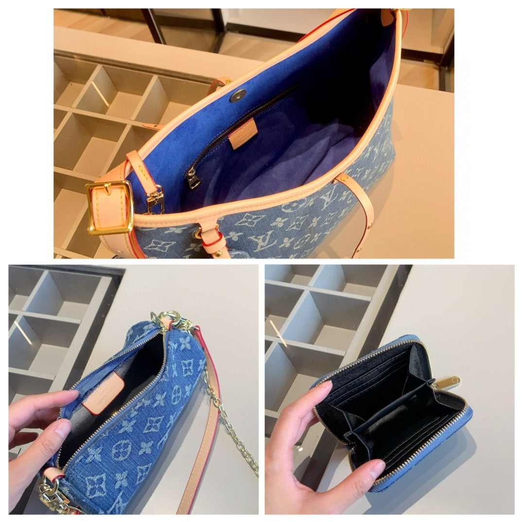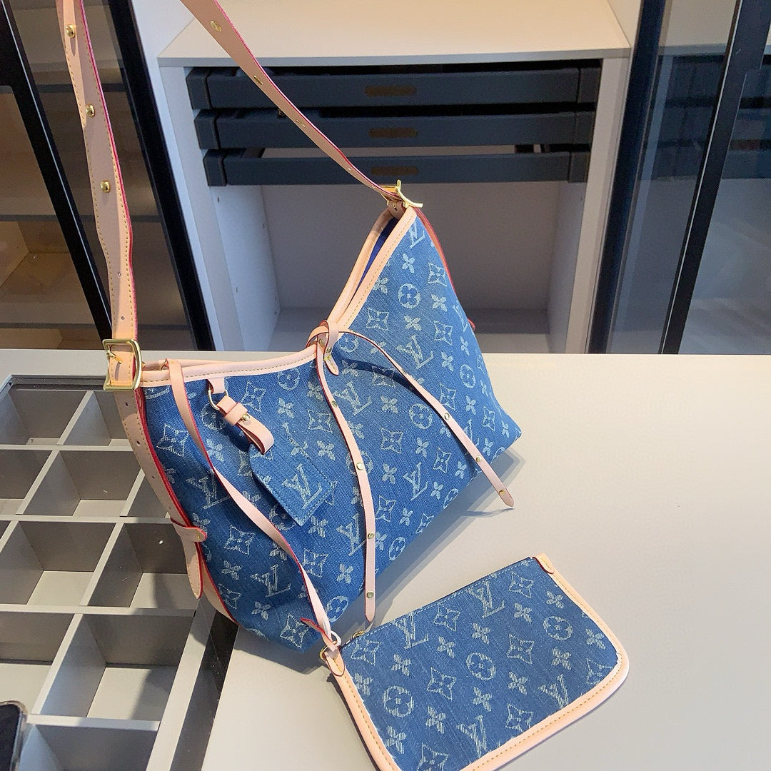 【ルイ・ヴィトン】☆キャリーオール トートバッグ|デニム素材の4点セット♪ベルトとチェーン付きで超おしゃれ!